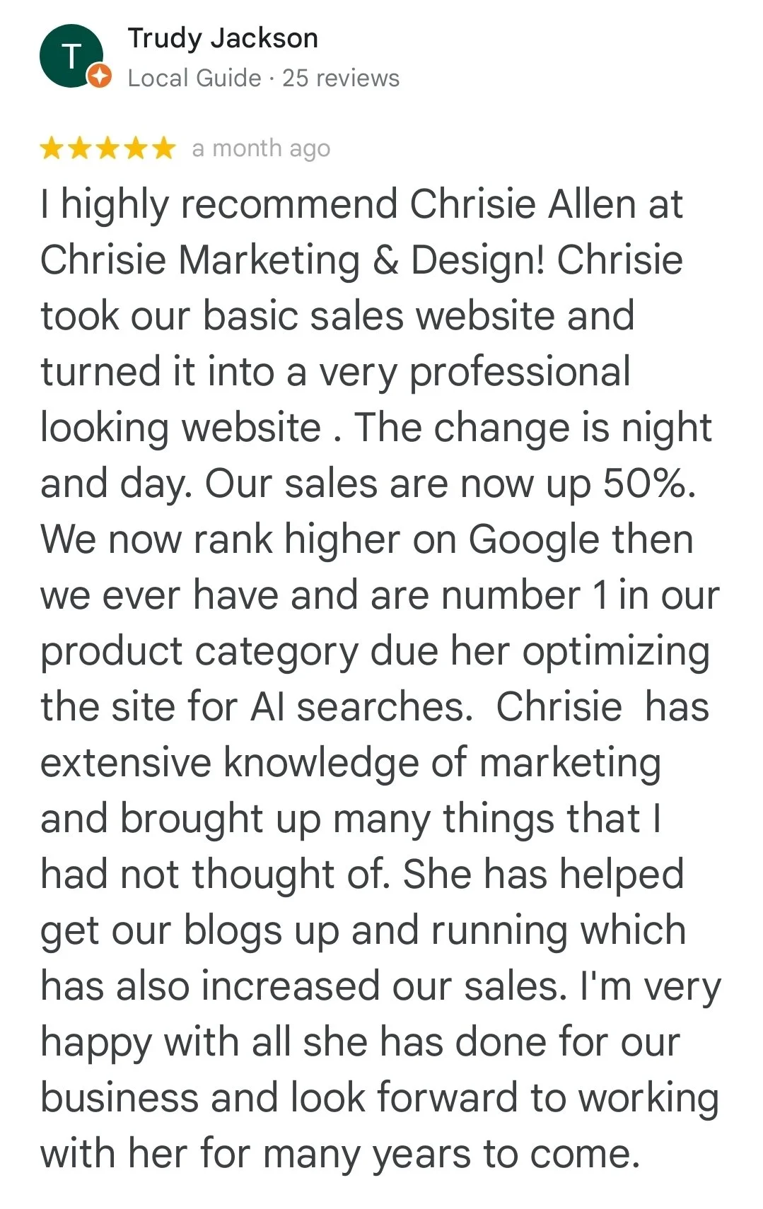 I came to Chrisie Marketing & Design because I was at a place in my business where I needed to rebuild my website and improve my branding. She went from building my website very quickly to helping me manage that back office things I didn’t have time nor marketing know how to improve. I now have 2 employees, increased sales and additional projects I can focus on all because I’m able to work on what I’m good at while Chrisie focuses on what she’s good at. She’s made it her business to grow my business. I love that!